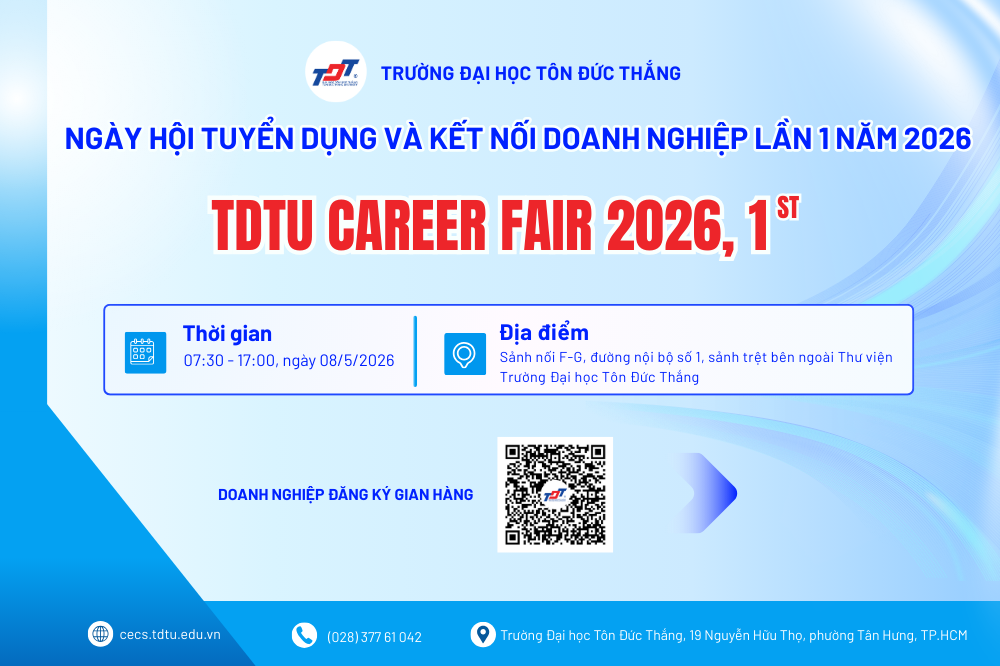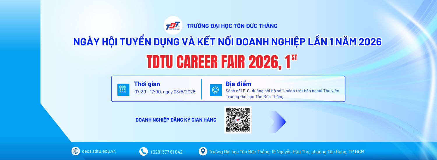 Home News-Events TDTU Trade Fair 2026 – Spreading Humanitarian Values, Strengthening Community Bonds News-Events WinCommerce Potential Store Manager Program Season 7 News-Events Ton Duc Thang University Organizes the 2nd Career Fair 2025 Domestic Enterprise Ton Duc Thang University Signs Cooperation Agreement with CT Group News-Events HDBank Future Banker 2025 Program News TDTU Trade Fair 2026 – Spreading Humanitarian Values, Strengthening Community Bonds News-Events , 31 Jan 26 WinCommerce Potential Store Manager Program Season 7 News-Events , 16 Jan 26 Read more >> Career and Alumni network Sign up Events T05 08 TDTU Career Fair 2026 – 1st Recruitment and Enterprise Connection Day at Ton Duc Thang University T04 14 TDTU STUDENT STARTUP DAY 2026 T03 24 Seminar titled “Building Personal Identity for a Solid Career Journey” Jobs Full-time Jobs Greenoly Full-time Jobs , 25 Mar 26 Greenoly Full-time Jobs , 25 Mar 26 Manpower Group Full-time Jobs , 20 Mar 26 Part-time Jobs Juvenis Maxime (JM) Part-time Jobs , 27 May 25 FPT TELECOM RECRUITS COLLABORATORS Part-time Jobs , 21 May 24 Seasonal Jobs Saigon Co.op Seasonal Jobs , 06 Jan 25 Le Meridien Saigon Hotel Seasonal Jobs , 23 Dec 24 TAN VAN EDUCATION SYSTEM Seasonal Jobs , 12 Jul 24 Startup Final Round of the “TDTU Student Innovation and Startup Contest for the Academic Year 2025-2026” Startup , 15 Jan 26 On January 8, 2026, Ton Duc Thang University (TDTU) hosted the Final Round of the “TDTU Student Startup Idea Search” Com Training Workshop “Effective Communication & Persuasive Public Speaking” within the framework of the Competition “TDTU Student Innovation and Startup Contest for the Academic Year 2025-2026” Startup , 12 Dec 25 On the afternoon of December 8, 2025, the Center of Enterprise Cooperation and Alumni of Ton Duc Thang University, in co Award ceremony - TDTU Student Innovation and Startup Contest for the Academic Year 2024-2025 Startup , 29 May 25 On May 28, 2025, the Organizing Committee of the TDTU Student Innovation and Startup Contest for the Academic Year 2024- Read more >> Enterprise Ton Duc Thang University Signs Cooperation Agreement with CT Group TDTU Signs Cooperation Agreement with Phuc Thinh Medical Joint Stock Company Ton Duc Thang University signs Cooperation Agreement with Tuoi Tre Newspaper Ton Duc Thang University and TTC Group Sign Strategic Cooperation Agreement Signed a cooperation agreement with BIDV Ky Hoa branch Contest "NURTURE VIETNAMESE GAMING TALENT 2024 - TOPEBOX ACCELERATOR" VPBANK TECHNOLOGY HACKATHON 2024 program Ton Duc Thang University Signed a Cooperation Agreement with the Vietnam Software & IT Services Association Ton Duc Thang University Signed a Cooperation Agreement with Ba Huan Corporation Signing an MOU between Ton Duc Thang University and KIS Vietnam Securities Joint Stock Company