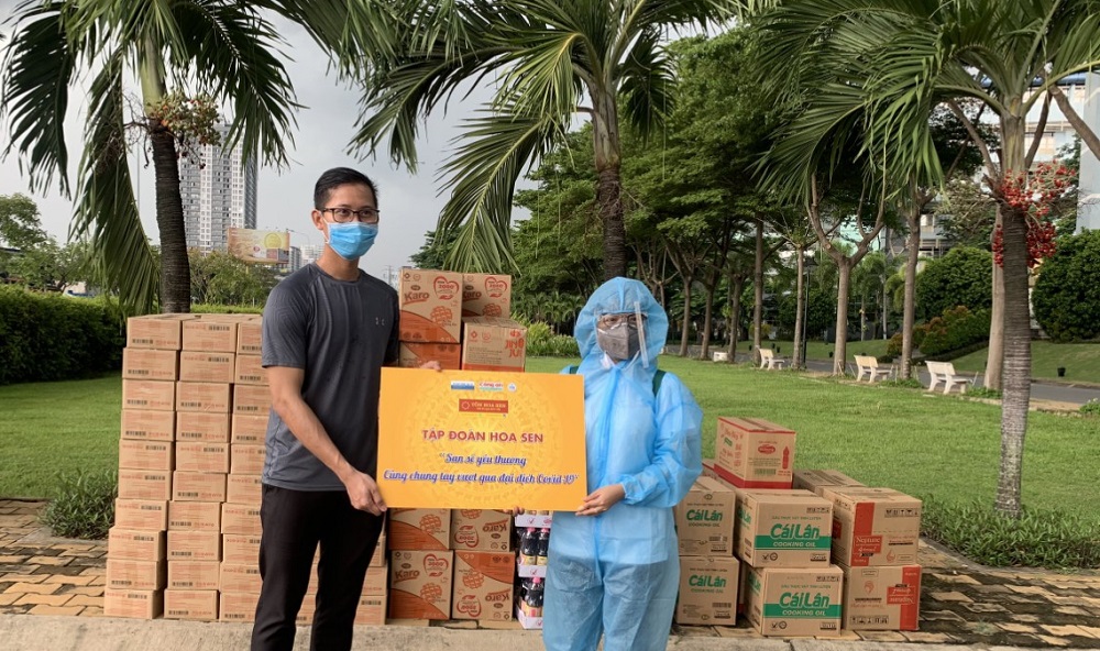 - Công ty cổ phần Tập đoàn Hoa Sen ủng hộ 1 tấn gạo, 170 thùng mì gói, 20 thùng bánh ngọt và một số nhu yếu phẩm khác.