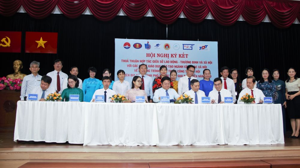 Ngày 21/11/2023, Sở Lao động - Thương binh và Xã hội (LĐTBXH) TP.HCM phối hợp cùng Trường Đại học Tôn Đức Thắng (TDTU), Học viện Cán bộ Thành phố, Trường Đại học Lao động Xã hội (Cơ sở 2), Trường Đại học Khoa học xã hội và Nhân văn TP.HCM, Phân hiệu Học viện Phụ nữ Việt Nam, Trường Đại học Sư phạm TP.HCM, Trường Đại học Mở TP.HCM tổ chức ký kết thỏa thuận hợp tác giữa Sở LĐTBXH với các cơ sở đào tạo ngành công tác xã hội về Chương trình phát triển công tác xã hội trên địa bàn Thành phố giai đoạn đến 2030.